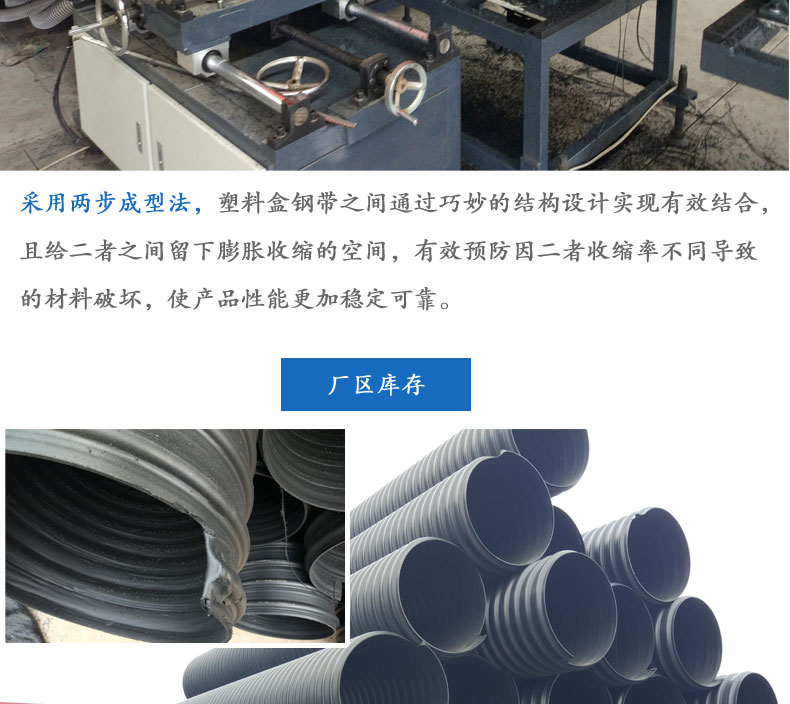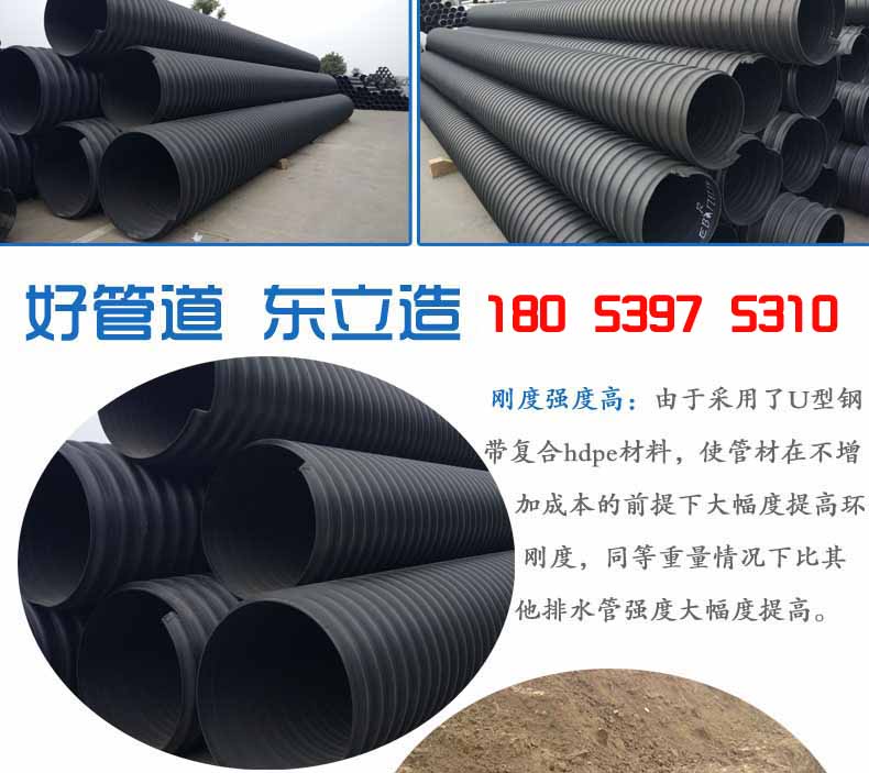 2.大口徑高強度:由于采用了U型鋼帶復合PE材料,使管材在不增加成本的前提下大幅度提高環剛度,同等重量情況下比其他塑料排水管強度大幅度提高。可解決重載等一系列問題,大口徑管材優勢更加明顯,比水泥管和其它塑料管重量更輕、強度更高。